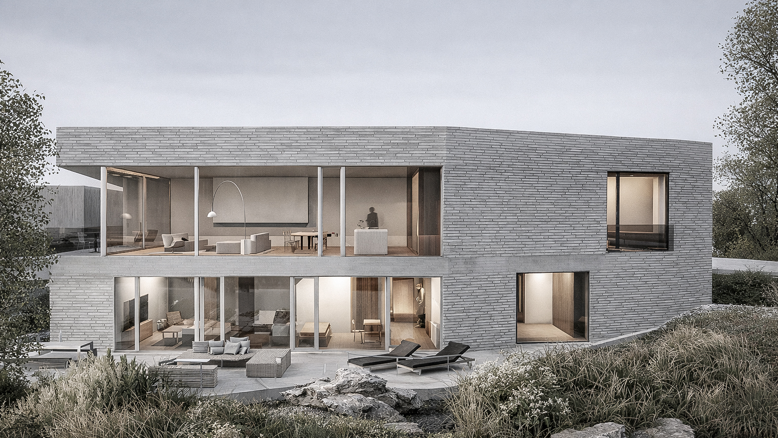 The home features a minimalist aesthetic, with its irregular shape grounded on a stone outcrop. Constructed with a wooden frame and low-emission concrete, the building’s facade is finished with fiber cement tiles in greige, seamlessly blending into the landscape and creating a natural harmony between the structure and its environment.
