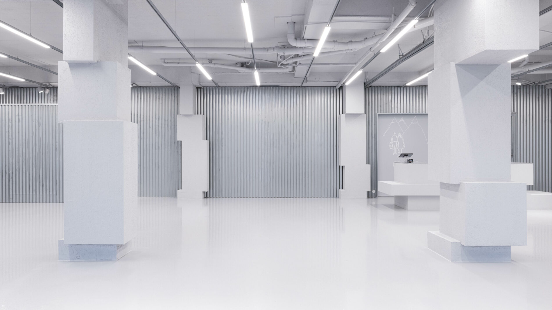 et nytt butikklokale i Ålesund, formet av skulpturelle, in situ-formede blokker og en nedtonet, vinterinspirert materialpalett.